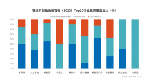 賽迪科創(chuàng)獨角獸百強(2023)中,獨角獸企業(yè)與國家及地方政府基金、知名資本機構(gòu)、大型互聯(lián)網(wǎng)企業(yè)投資關(guān)聯(lián)度達到93%,分別投資覆蓋(含重復(fù))了69家、65家、35家獨角獸百強,初步形成“知名資本+大型互聯(lián)網(wǎng)企業(yè)+政府投資”三方格局。其中,新能源汽車、新能源、半導(dǎo)體和新材料行業(yè)政府基金投資覆蓋均超過50%,成為最受關(guān)注的賽道。