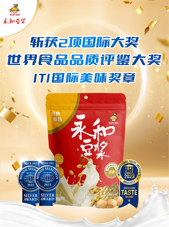 永和豆?jié){一路走來,不斷追求卓越品質(zhì),積極對(duì)標(biāo)嚴(yán)格的國(guó)際標(biāo)準(zhǔn),打造營(yíng)養(yǎng)美味的豆?jié){產(chǎn)品。2022-2023年,永和豆?jié){旗下經(jīng)典原味豆?jié){粉350g憑借專業(yè)配方和匠心工藝,連續(xù)斬獲蒙特獎(jiǎng)和ITI國(guó)際美味獎(jiǎng),閃耀世界舞臺(tái)。